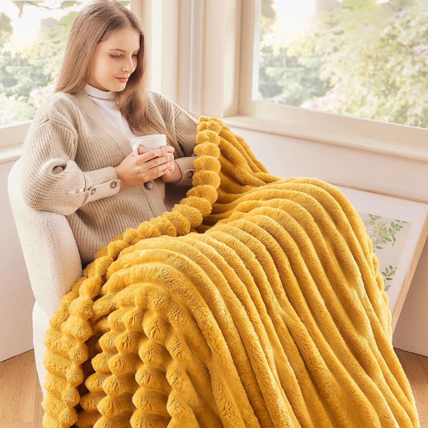 NEWCOSPLAY Super Soft Throw Blanket Mustard Yellow Premium Silky Flannel Fleece 3D Ribbed Jacquard Lightweight Bed Blanket All Season Use (Mustard Yellow Ribbed, Throw(50"x60"))