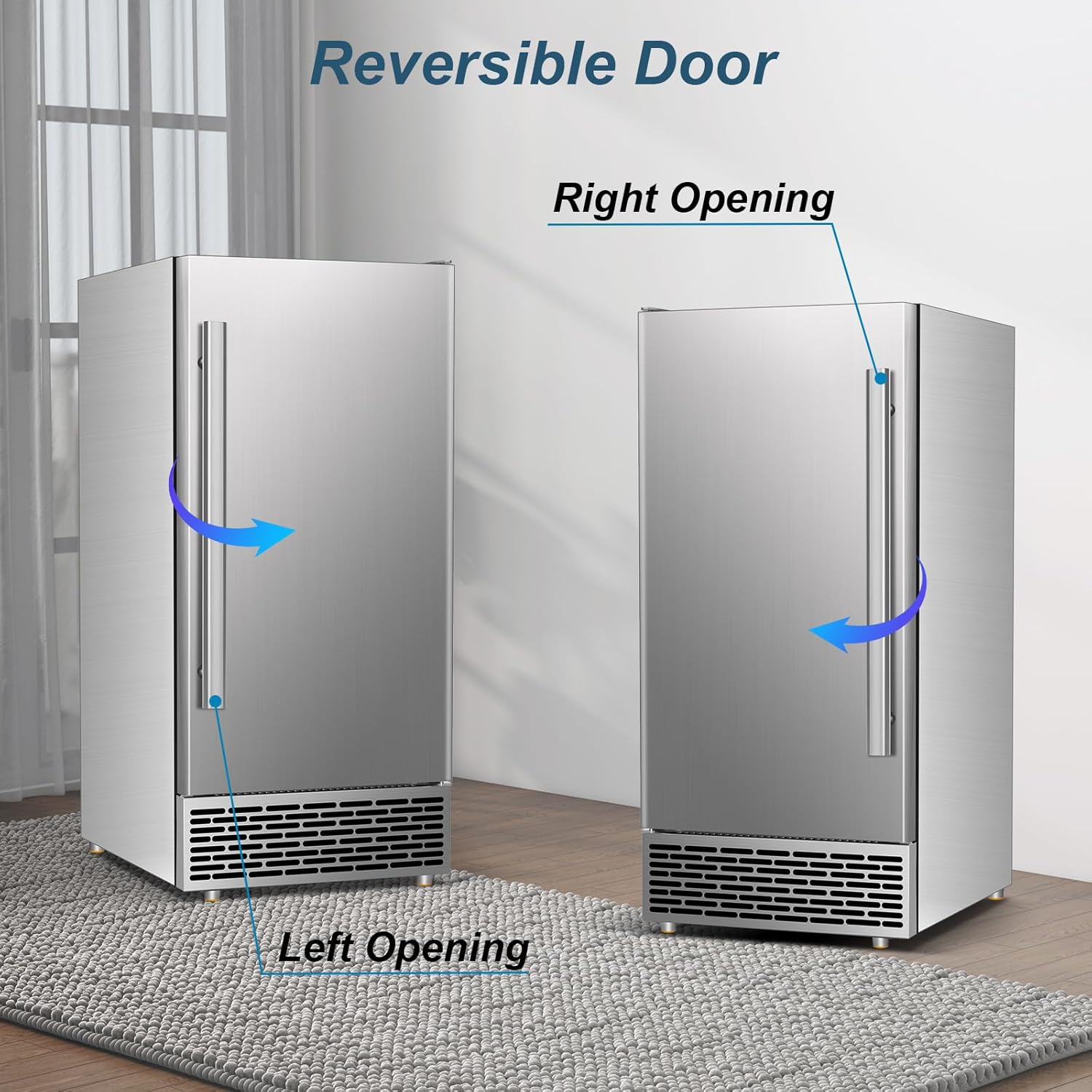 - EFFICIENT ICE MAKING & REVERSIBLE DOOR: Equipped with a powerful, low-noise compressor, this commercial Ice Machine delivers fast, quiet, and efficient performance. And this freestanding ice maker machine has a reversible door hinge design, so you can adjust the door opening direction according to the space and layout. An ice scoop is also included for convenience.