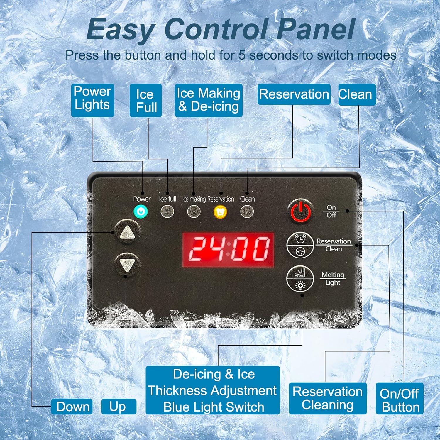 - SMART OPERATION & INDICATOR LIGHTS: This undercounter ice maker machine features a user-friendly control panel with a clear LCD. The undercounter ice machine offers multiple functions, including adjustable ice thickness, Appointment setting, one-touch auto cleaning, and indicator light alerts. When the ice bin is full, it will give a prompt and stop making ice to prevent overflow. And built-in blue LED lighting.