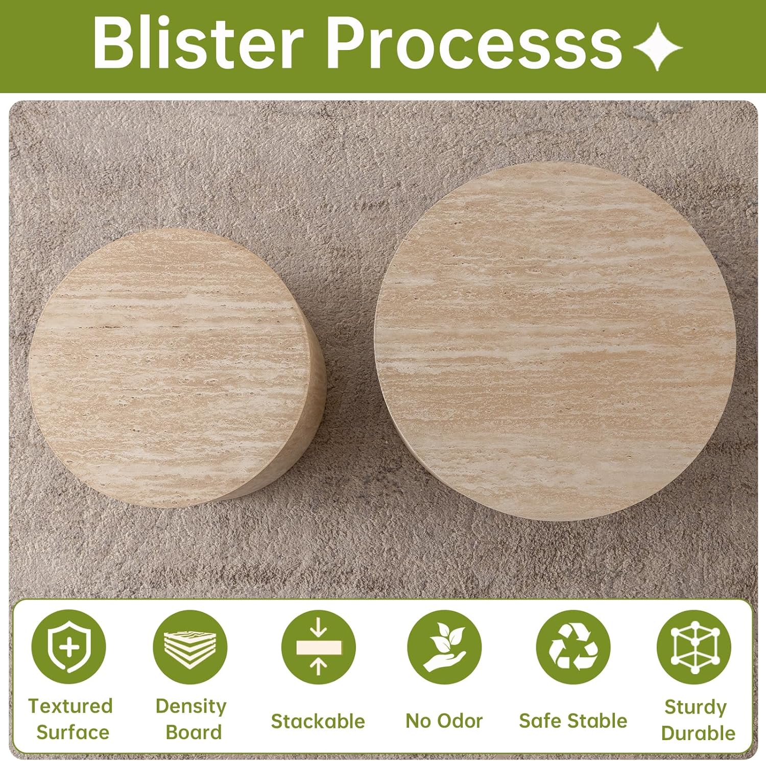 - [Timeless Aesthetic, Effortless Elegance] Designed with a sleek round silhouette and a chic beige textured finish, this nesting table set complements modern, industrial, farmhouse, and luxury interiors alike. Round coffee table set of 2 a statement piece that always feels right at home!